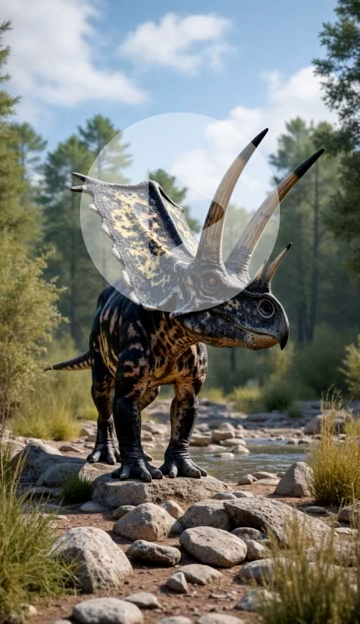 Pentaceratops had five horns and a huge frill. It was one of the largest horned dinosaurs and lived in herds.