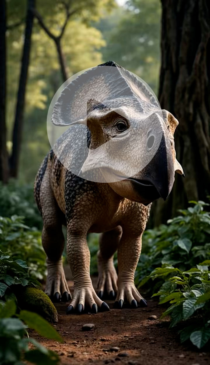 Protoceratops was a small frilled herbivorous dinosaur. It lived in the desert and defended itself with a sharp beak.