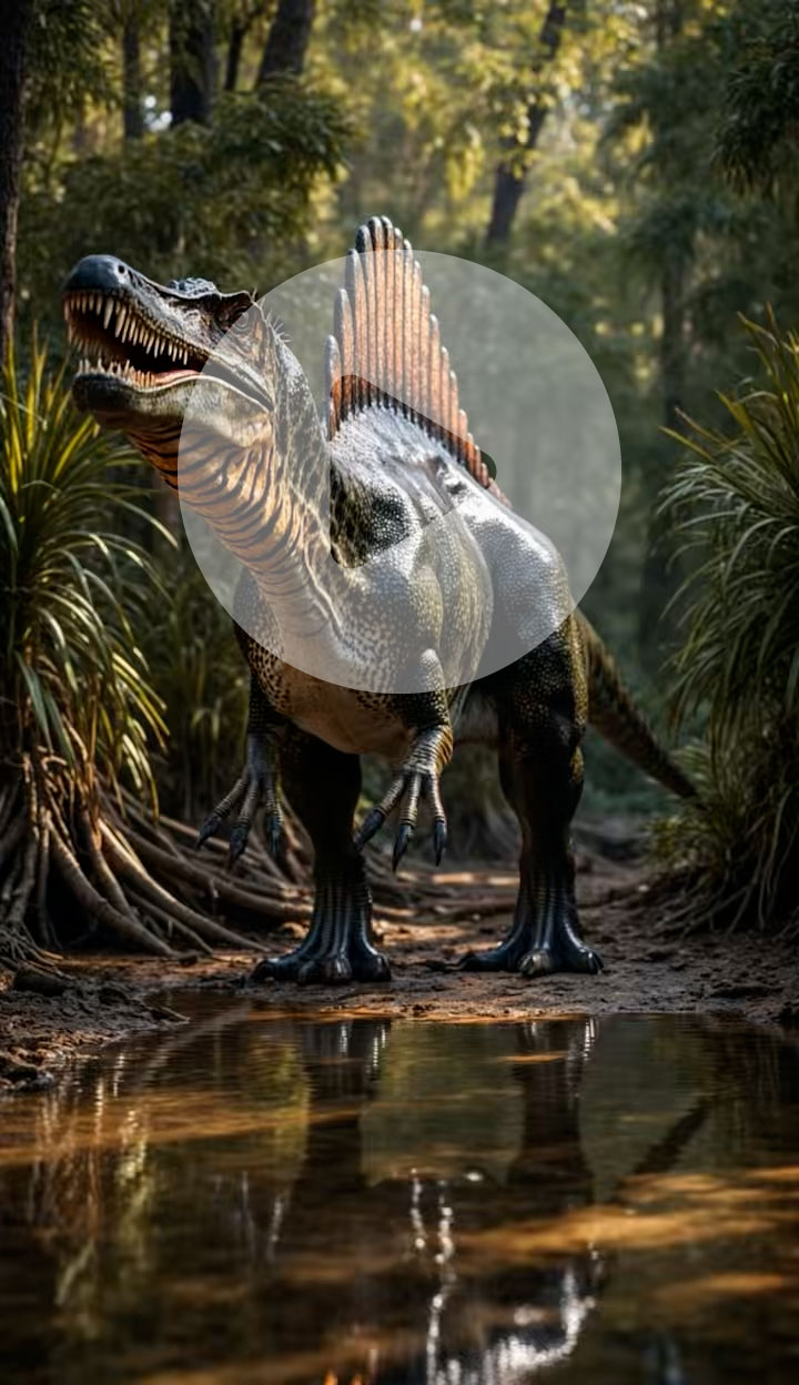 Spinosaurus was a giant dinosaur with a sail on its back. It lived near water and mostly ate fish.
